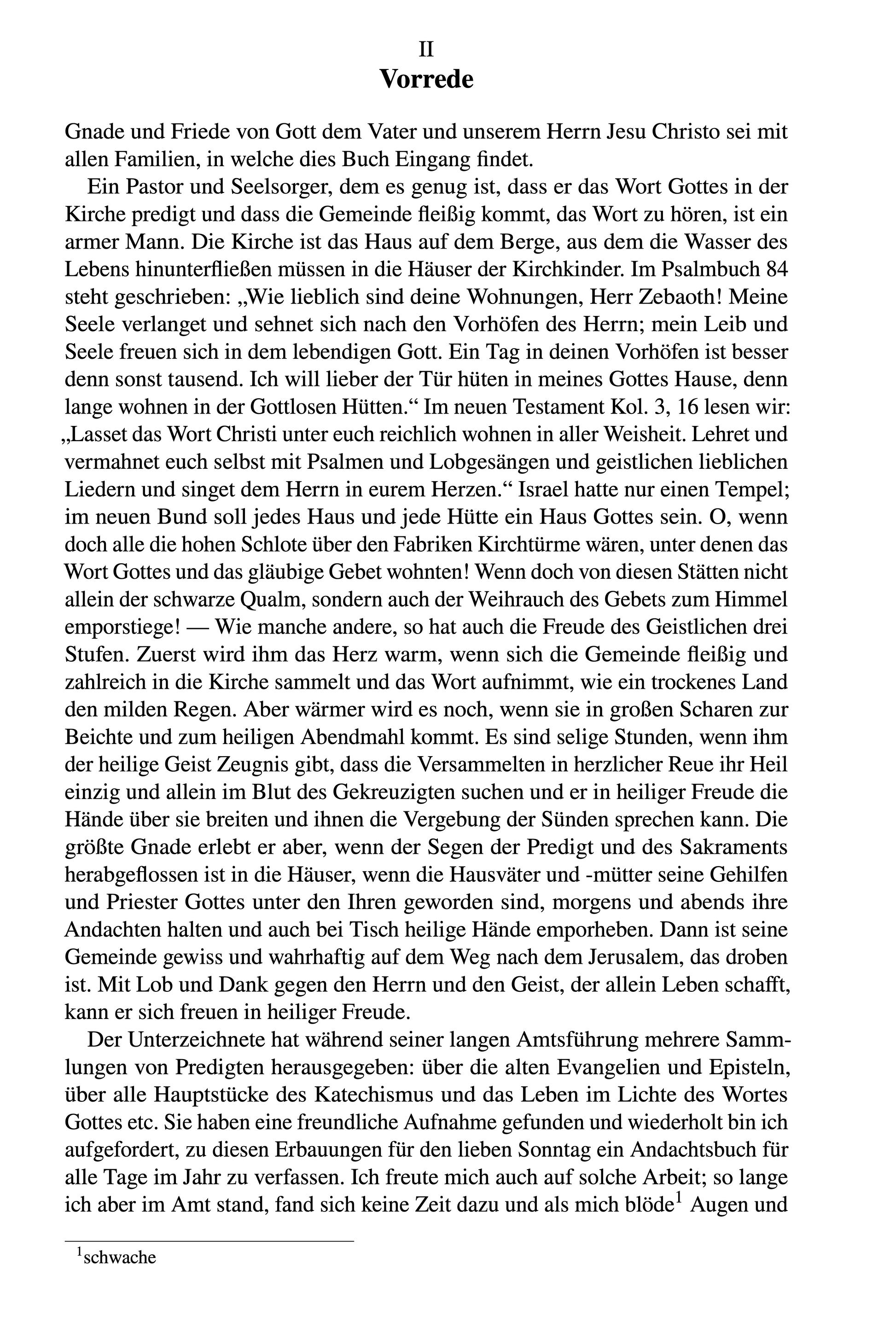 Es handelt sich um eine unveränderte Neuauflage der zweiten Auflage aus dem Jahr 1889. Die Auslegung der kurzen Andachten für jeden Tag sind den verschiedenen Predigtsammlungen von Dr. Friedrich Ahlfeld entnommen. Die Andachten sind nach dem Kirchenjahr geordnet. Die Andachten sind kurz gehalten und enthalten einen Bibelvers, die Auslegung, ein Gebet und passende Liederverse.