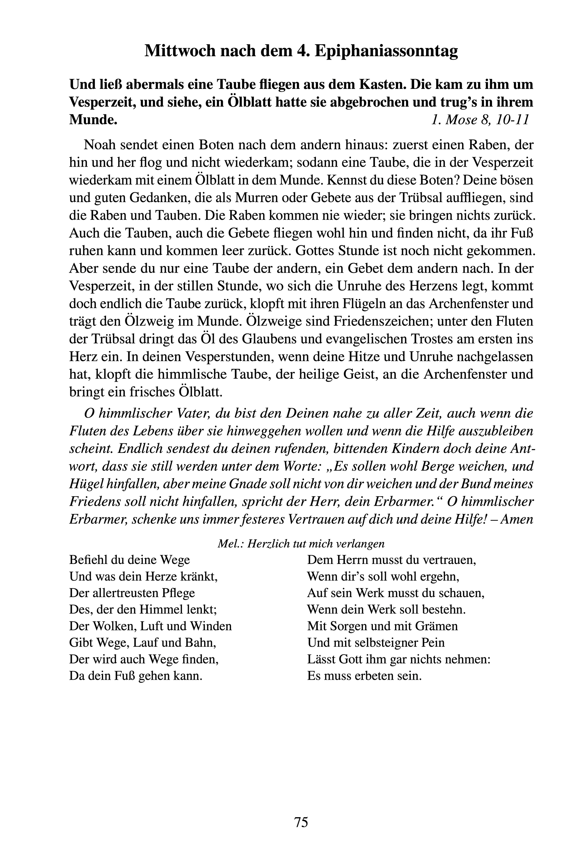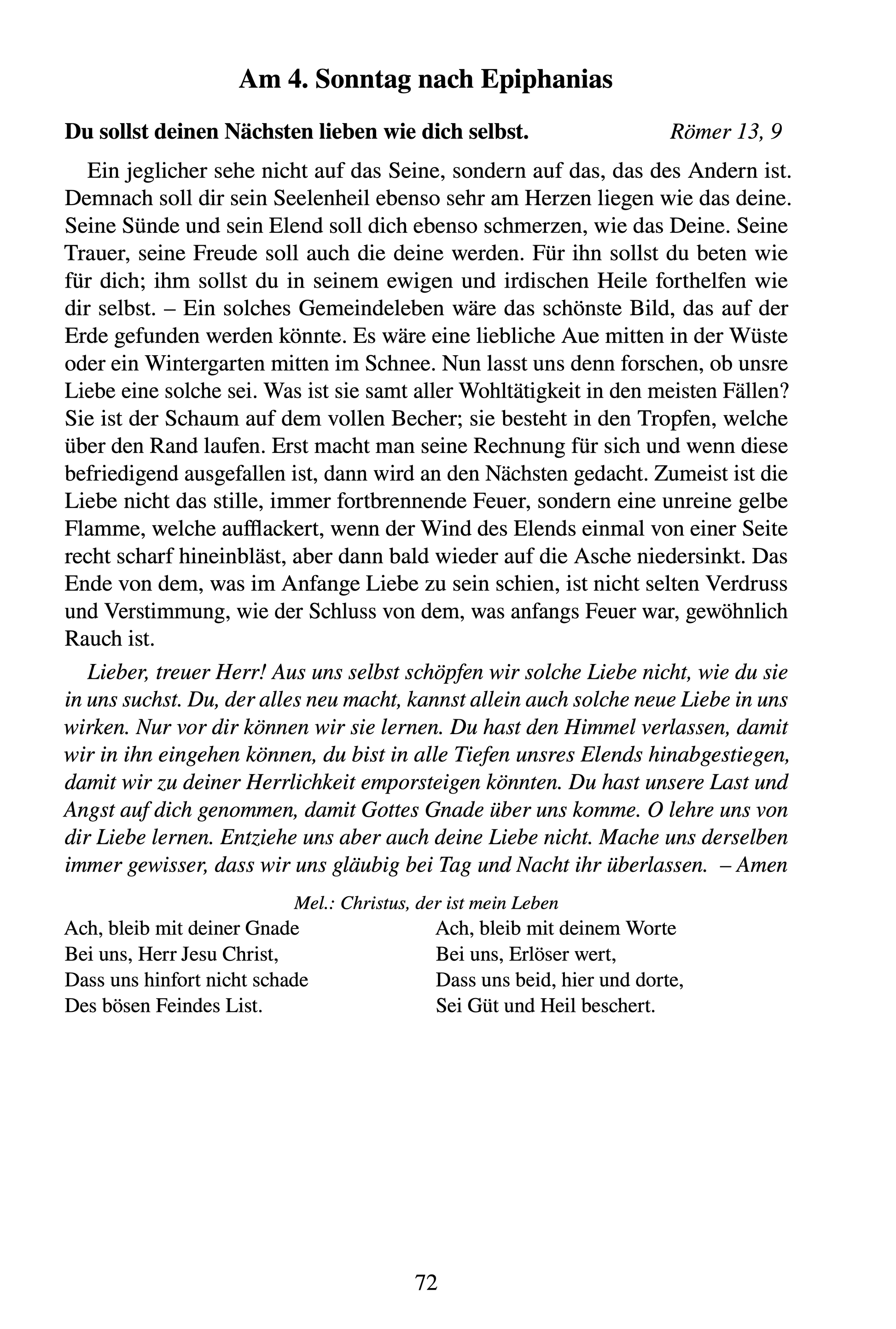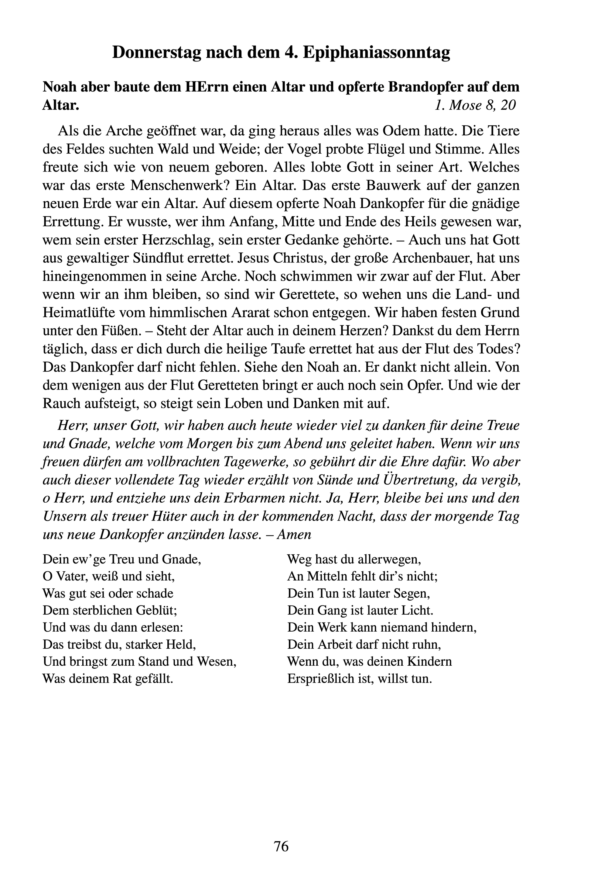 Es handelt sich um eine unveränderte Neuauflage der zweiten Auflage aus dem Jahr 1885. Die Auslegung der kurzen Andachten für jeden Tag sind den verschiedenen Predigtsammlungen von Dr. Friedrich Ahlfeld entnommen. Die Andachten sind nach dem Kirchenjahr geordnet. Die Andachten sind kurz gehalten und enthalten einen Bibelvers, die Auslegung, ein Gebet und einen passende Liedervers.